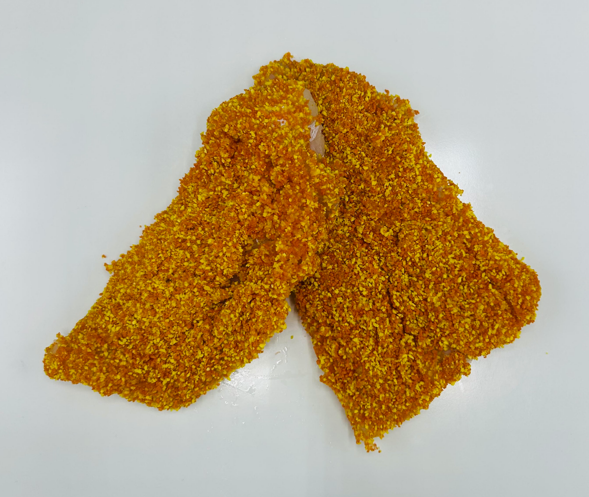 Þorskur (80%) (fiskur), raspur (hveiti (glúten), vatn, ger, salt, litarefni: Curcumin (turmerik) [E100] og annatto (roðafræ) [E160b]), egg, krydd.